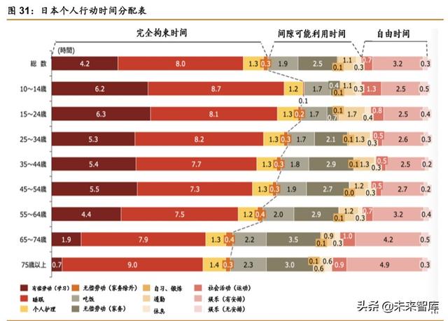 25 岁及以上人口具有更多的闲暇时间,随着身体物理机能的下降和数字内容的兴起, 内容消费潜力将进一步得到释放。10-24 岁之间的完全拘束时间较长,35 岁开始完全拘束时 间缩短,自由时间逐步提升,释放更多内容消费潜力。
