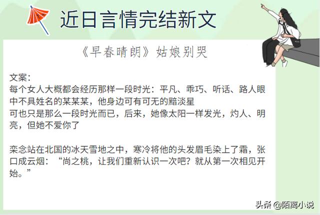 05《早春晴朗》姑娘别哭点评:好看!番外咋就写的男主妈妈?写点男女主婚后呀!十来年感情,一步步来,男主虽然嘴贱,但是一步步伴着女主成长,应该就是女主成长路上的引路灯吧。其实这么多年两人感情也没第三人,就是男主一直没发现早早就爱上了女主,活该他又等那么多年!